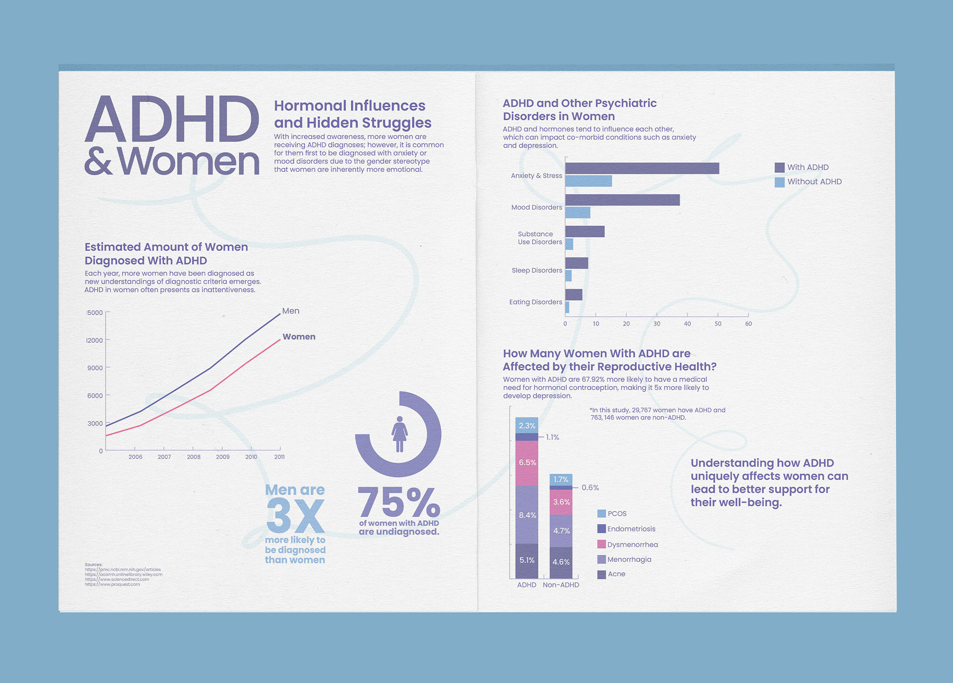 Women's hormones and ADHD is a very underresearched topic. While there's no direct causation, there seems to be a consistent trend of women with ADHD who also have varying mental health and reproductive health disorders. After extensive research, a vast amount of information was only sourced from Sweden. Creating this infographic to bring awareness to an issue that's so unknown inspired me. The audience is intended for women ages 18–55 and would be found inside a women's health magazine. The colour palette is meant to feel calm, gentle, and validating as such issues should be treated. The background element was kept to a minimum to add flow without removing the main message. A sans-serif typeface was chosen to fit the theme and feel clean.
